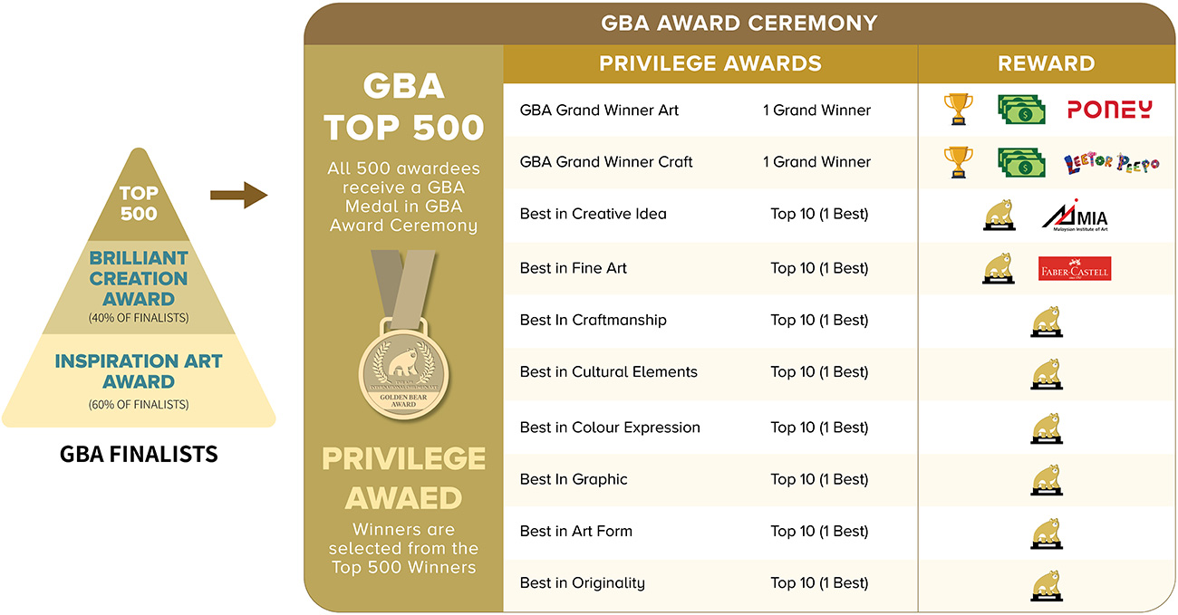 The Top 500 will be invite to GBA Grand Ceremony to receive their GBA Medals on stage and Privilege Award winners will also be announced who are selected among the Top 500 winners. The GBA Grand winners will receive an exclusive GBA Grand Trophy and Cash Prize of RM1,000.
