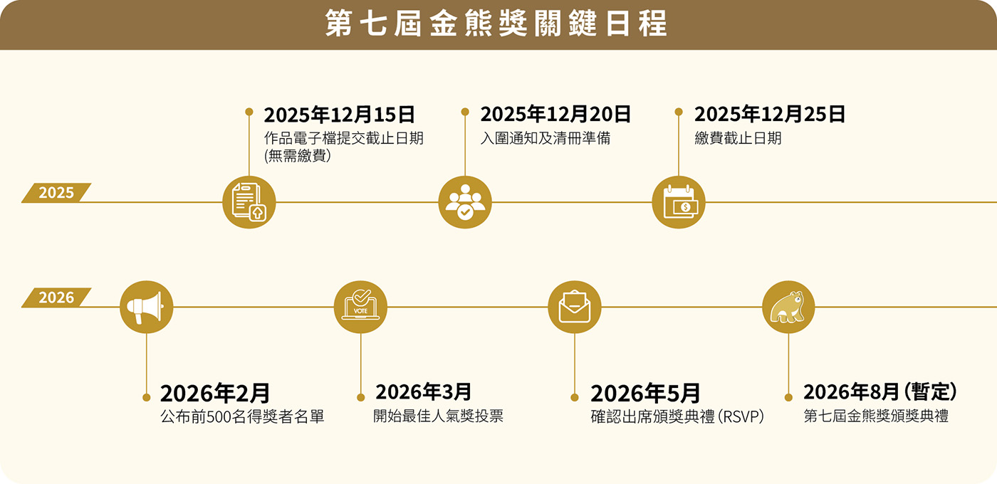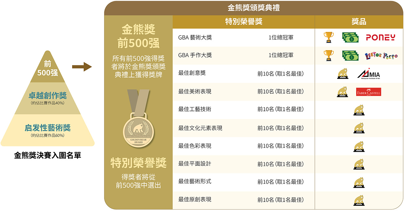 前 500 名得獎者將受邀參加頒獎典禮,於舞台上親領金熊獎獎牌。同時,將公佈從前 500 名中評選出的「特別榮譽獎」得主。而金熊獎大獎得主將榮獲專屬金熊獎大獎獎盃及馬幣 1,000 元獎金。