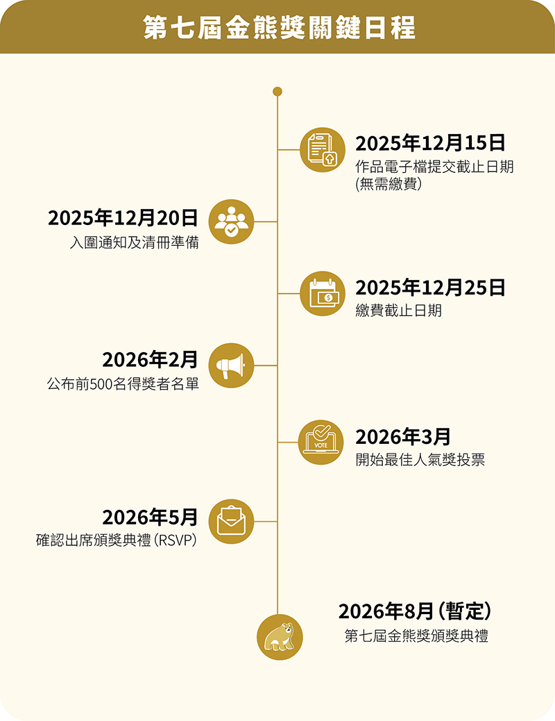 一旦確認參賽後,您孩子的作品將進入金熊獎決賽評審階段。評審團將從中選出前 500 名得獎者,並邀請他們於 2026 年 8 月出席金熊獎頒獎典禮。其餘入圍者則將依評審結果獲得「卓越創作獎」或「靈感藝術獎」。